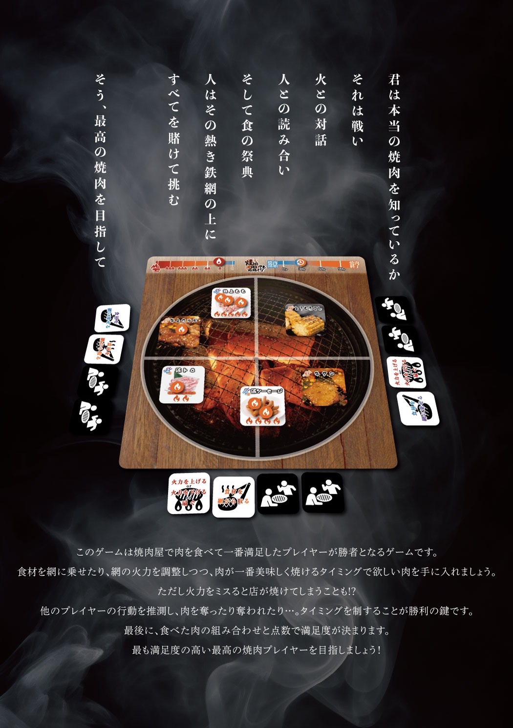 このゲームは焼肉屋で肉を食べて一番満足したプレイヤーが勝者となるゲームです。